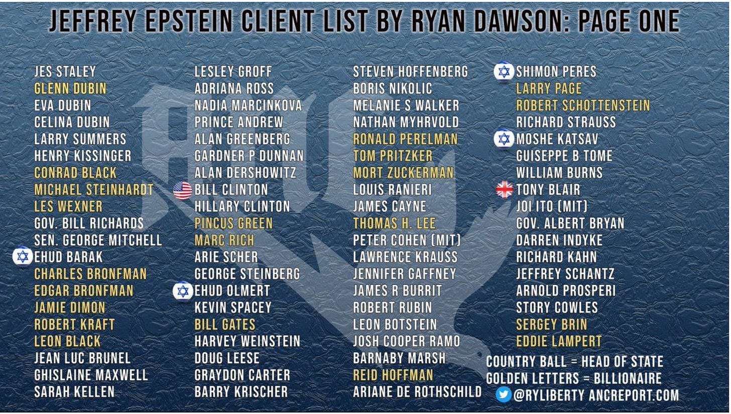<< Although Donald Trump and Pam Bondi insist that there is no Epstein Client List... there is a list and it is reproduced above with the permission of its author, Ryan Dawson. Ryan compiled the list the old-fashioned way... he combed through court transcripts and charging documents. He only put names on the list if the victims of Epstein's pedophilia enterprise identified or named a particular individual. As you peruse the list you will notice that there are some very wealthy, powerful individuals named. Not one of them has brought a libel or slander legal action against Ryan. If he was posting false material, he would have been a certain target of lawsuits…